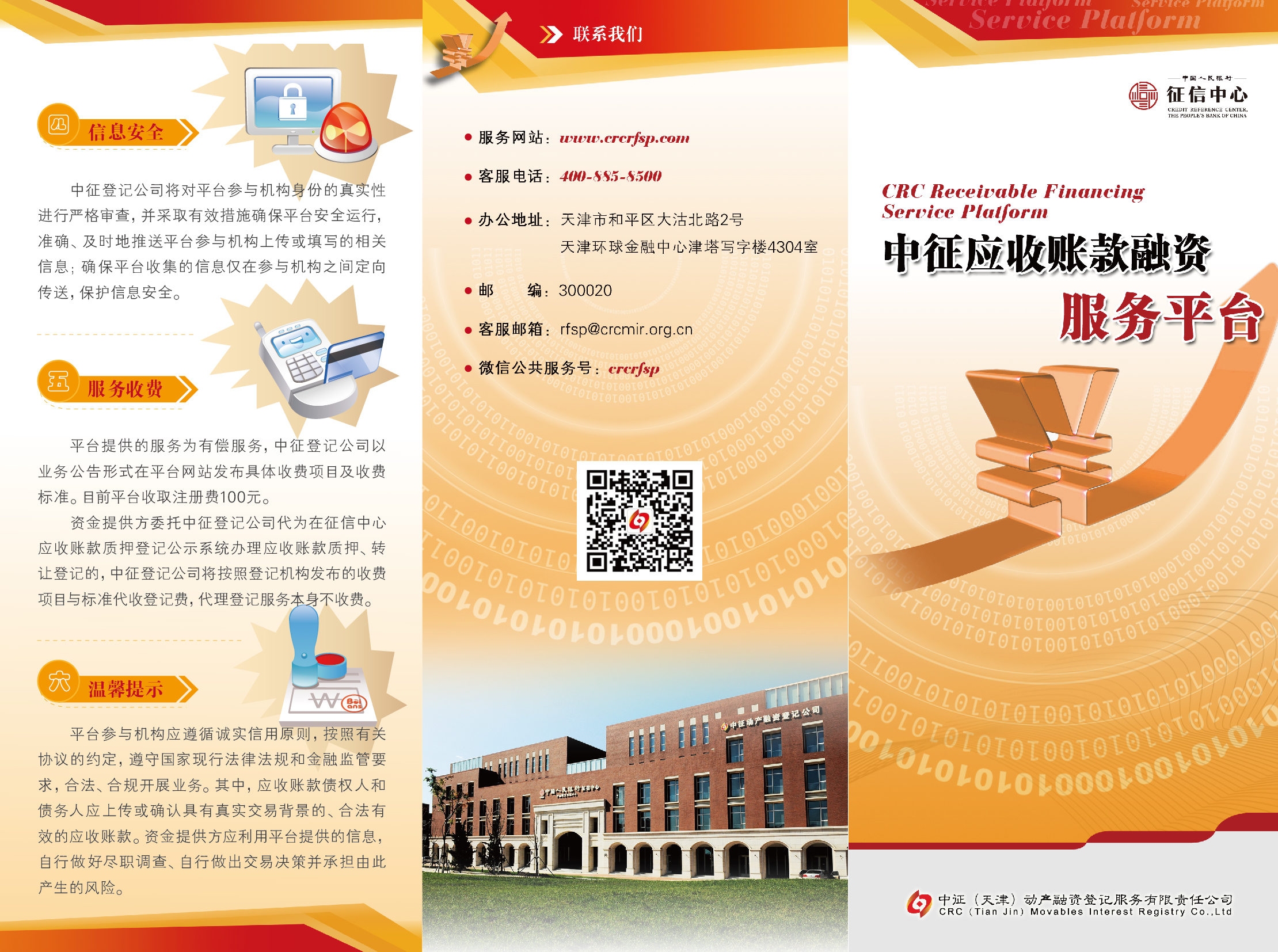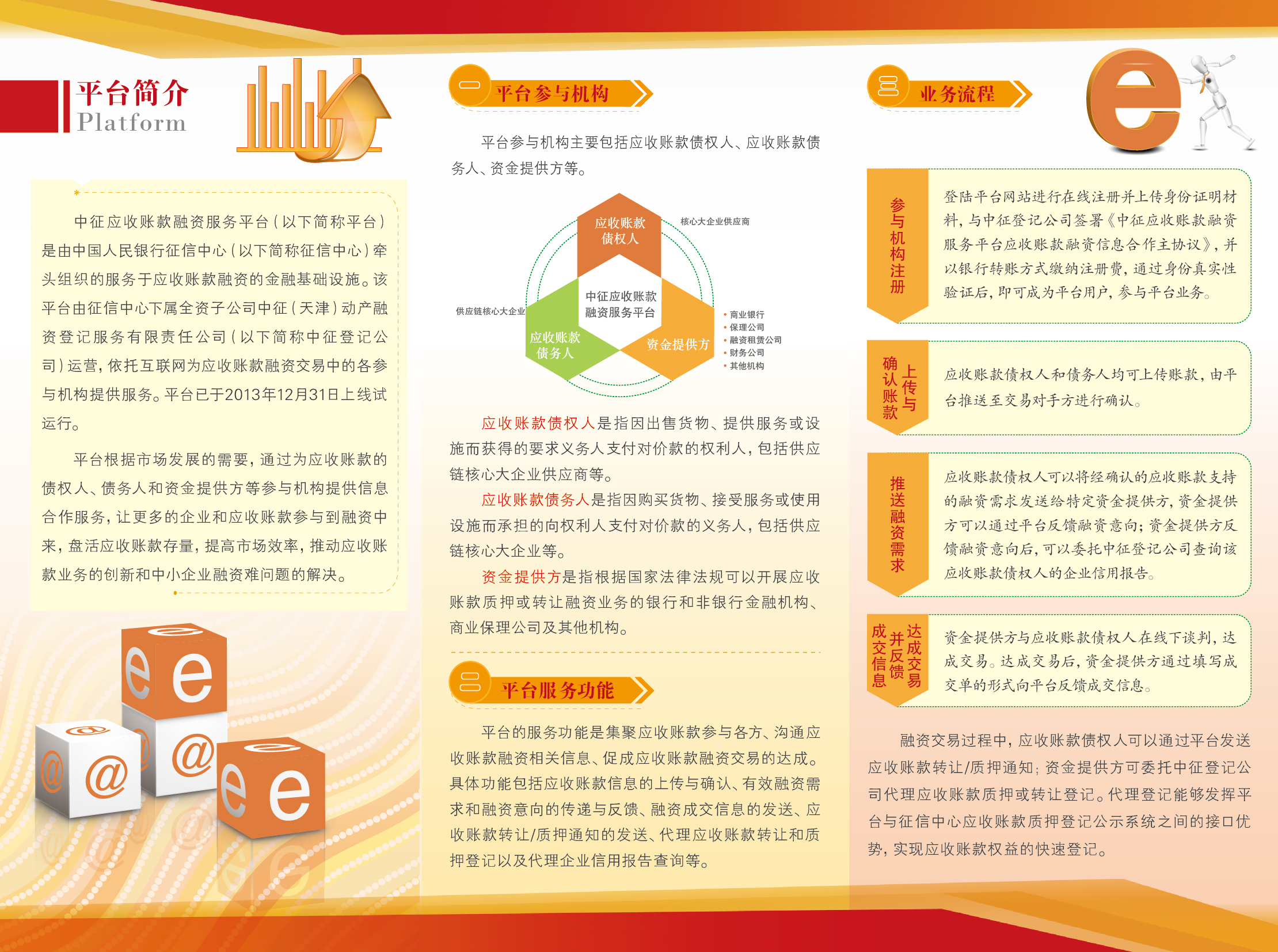 中征应收账款融资服务平台(以下简称平台)是由中国人民银行征信中心(以下简称征信中心)牵头组织的服务于应收账款融资的金融基础设施。该平台由征信中心下属全资子公司中征(天津)动产融资登记服务有限责任公司(以下简称中征登记公司)运营,依托互联网为应收账款融资交易中的各参与机构提供服务。平台已于2013年12月31日上线试运行。